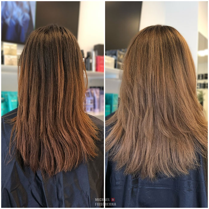 Här vill vi få håret ljusare och få bort den varma nyansen.