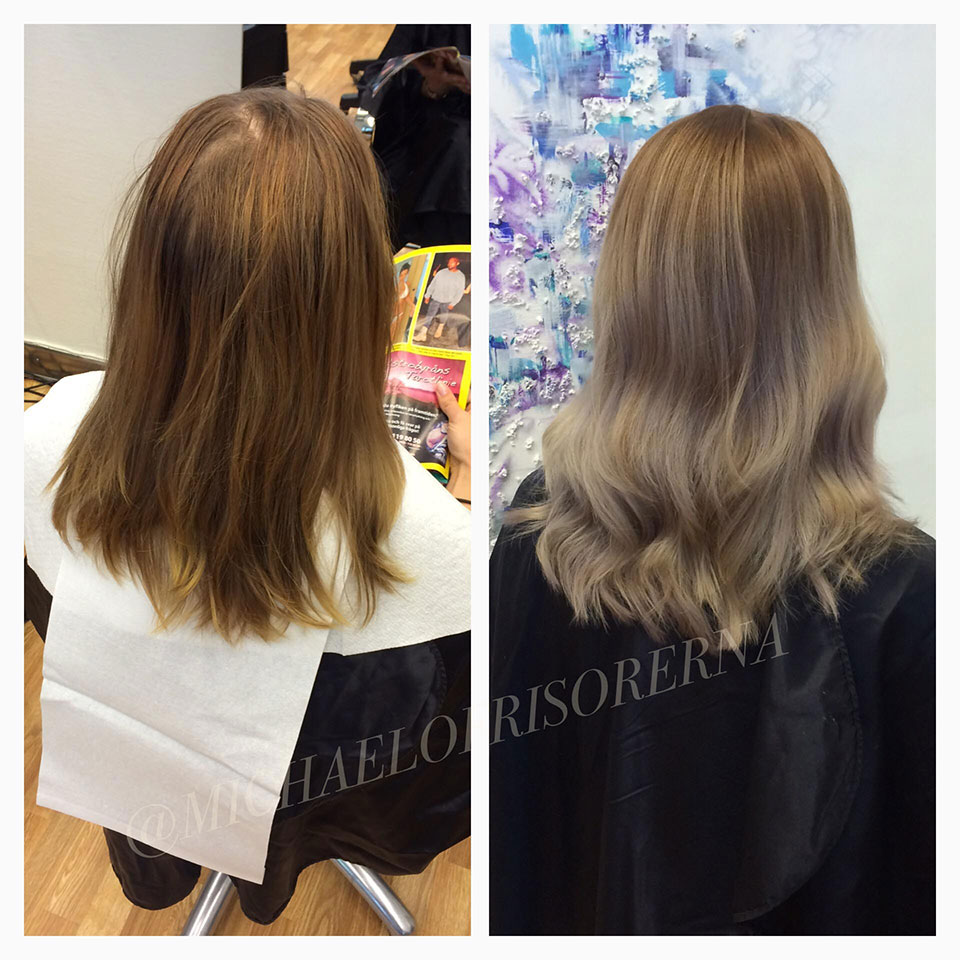 Linns kund kom in med en väldigt varm och gammal färg. Hon börjar att bleka längderna, så det blir en soft övergång mot botten. Tonar sedan i en kall nyans.