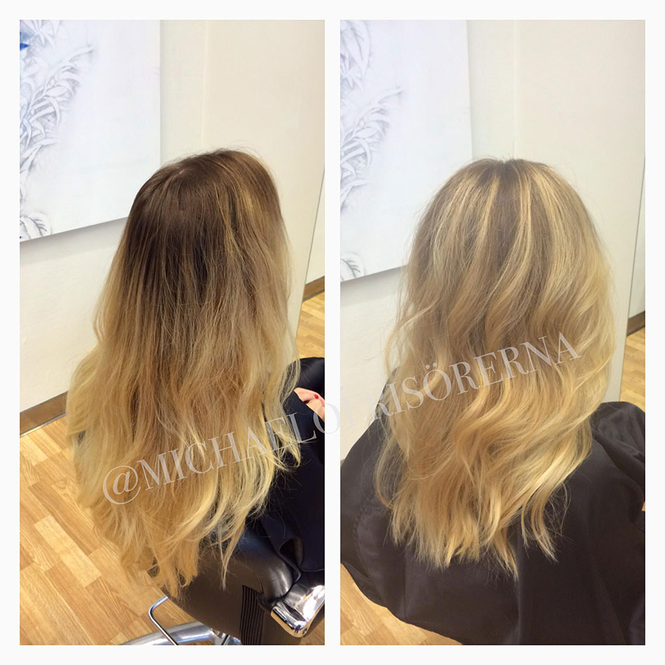 Vår frisör Amanda gör denna ljusare ombren. Hon börjar med att slinga upp håret väldigt soft mot botten för att få bort kanten. Avslutar sen med en nyanserande toning.