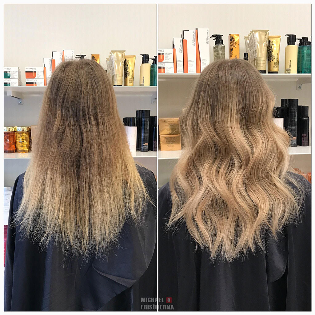 Vi slingar upp håret i en Balayageteknik och behåller kundens naturliga bottenfärg.